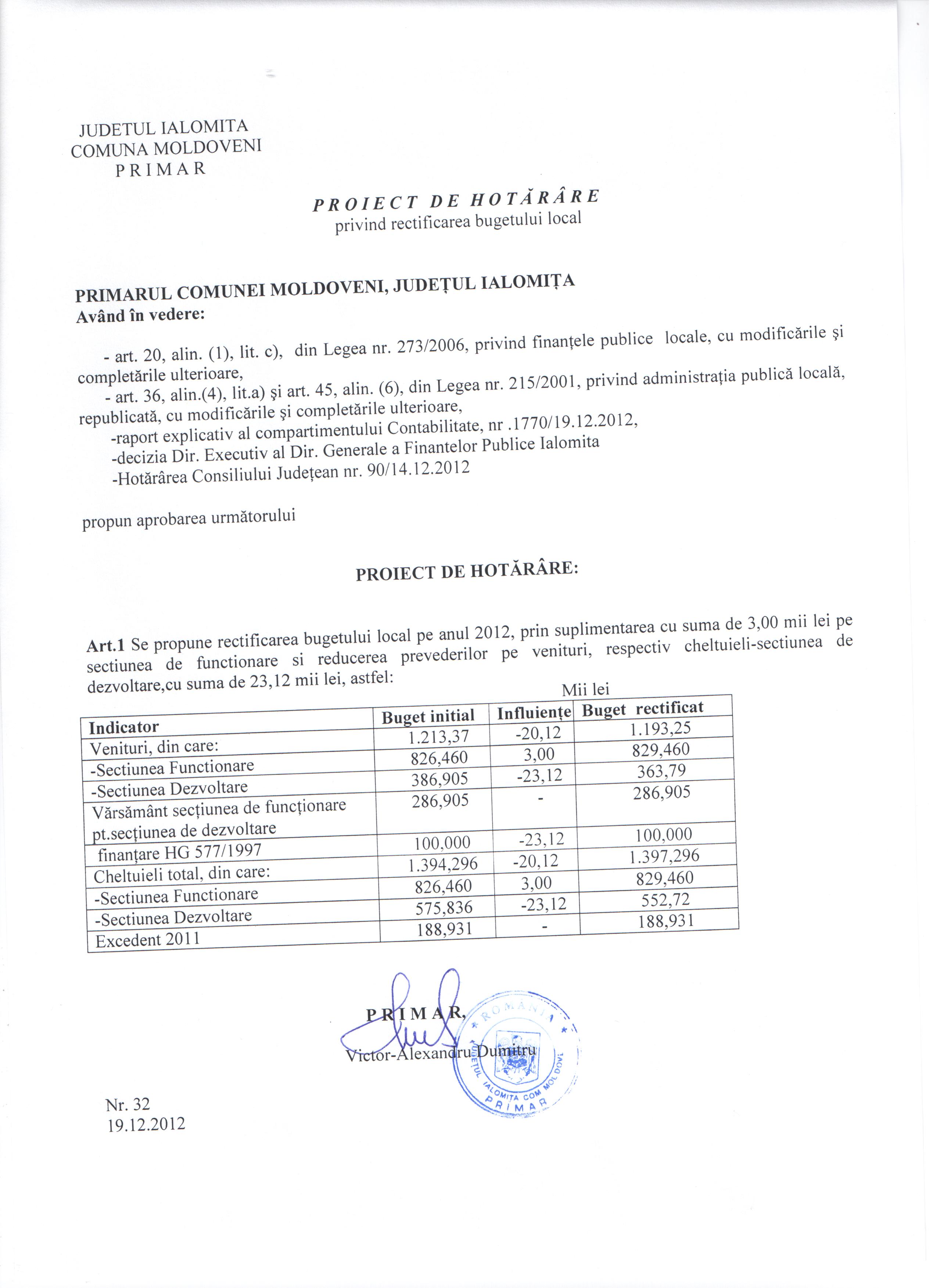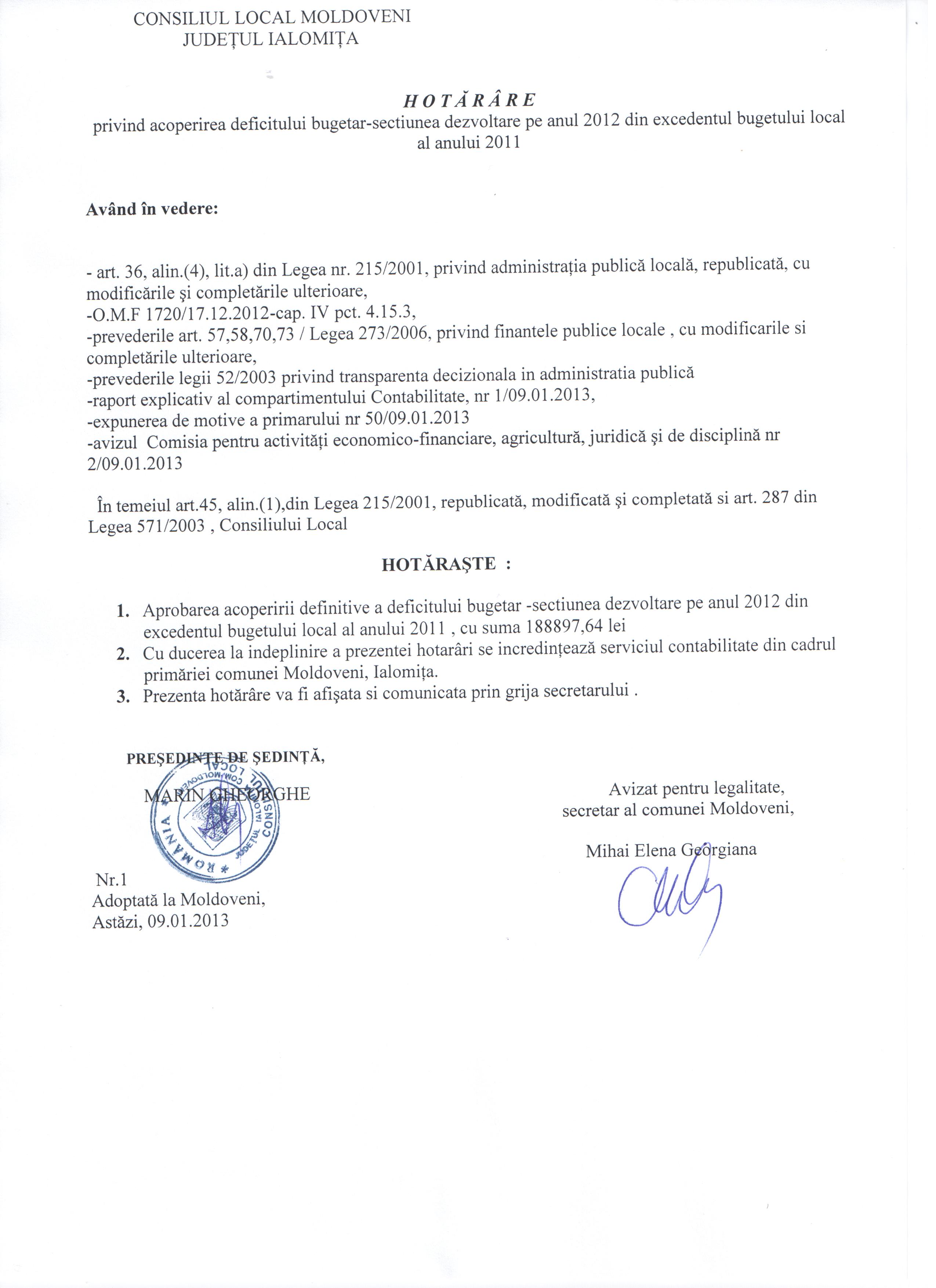 - Hot. nr. 01/09.12.2012 privind acop. deficitului bug. sectiunea dezv. pe anul 2012 din excedentul bug. loc. pe anul 2011.