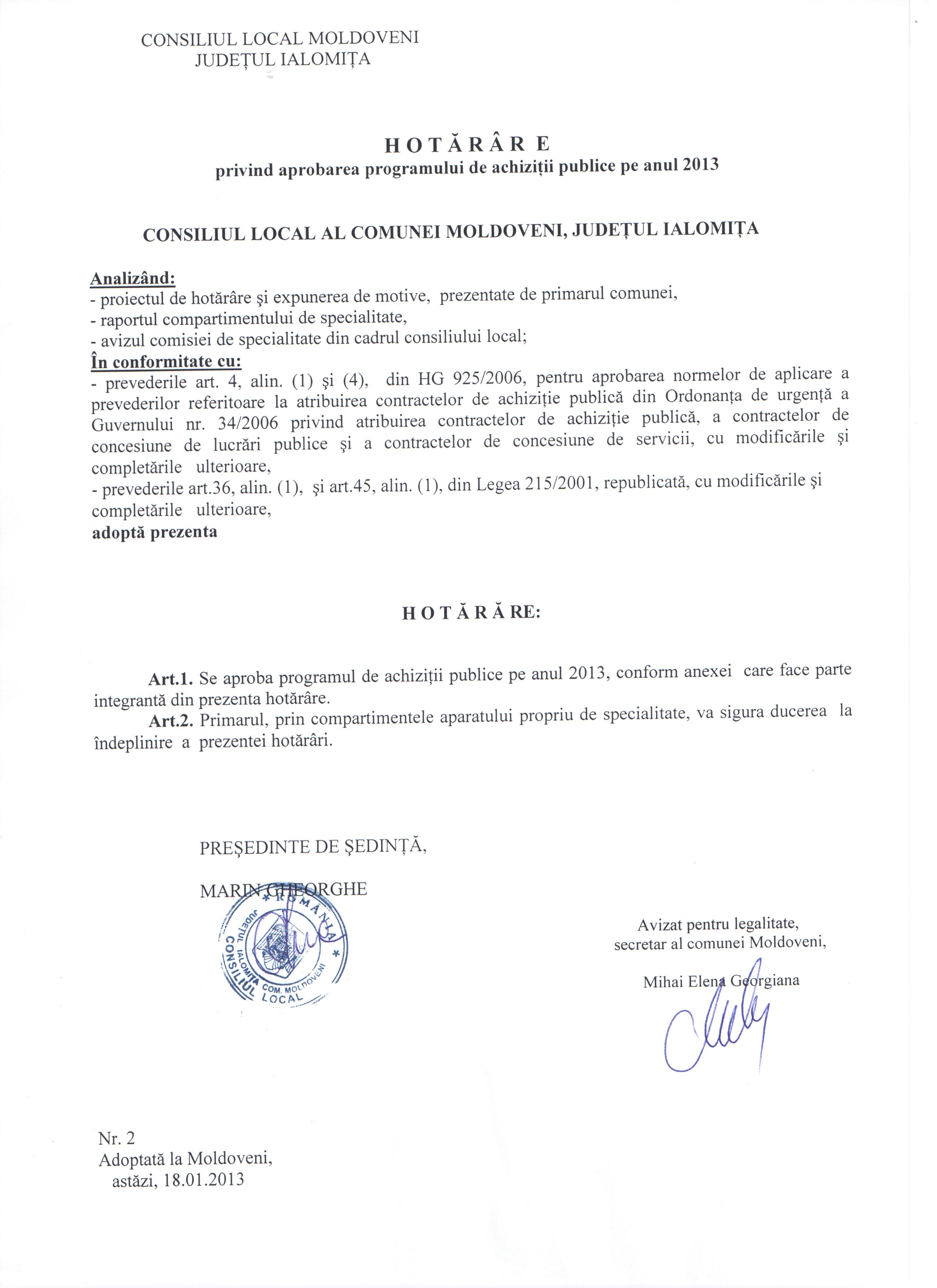 - Hot. nr. 02/18.01.2013 privind aprobarea planului de achizitii publice pe anul 2013.