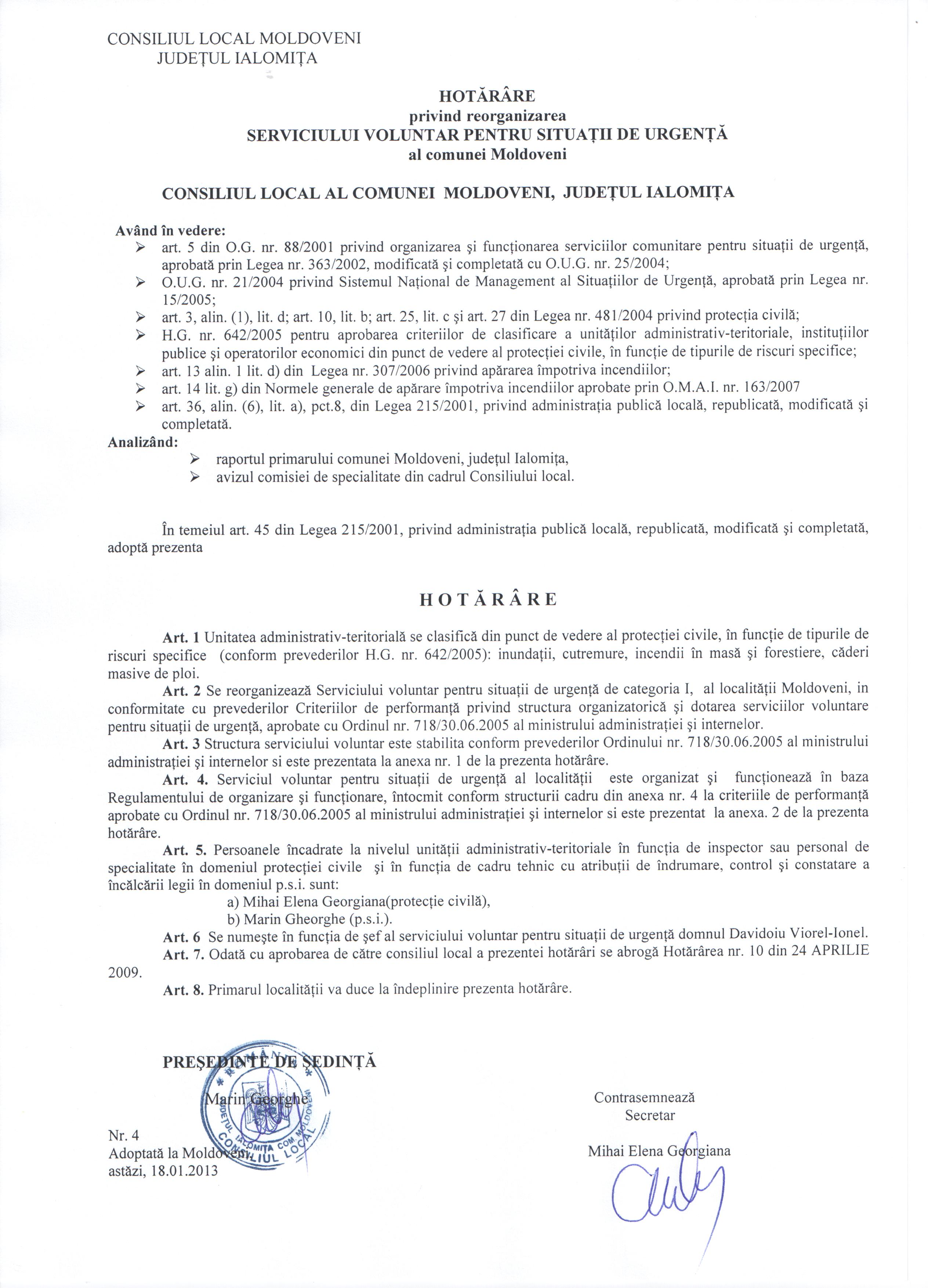 - Hot. nr. 04/18.01.2013 privind reorg. SERVICIULUI VOLUNTAR PT. SITUATII DE URGENTA al com. Moldoveni, jud. IL.