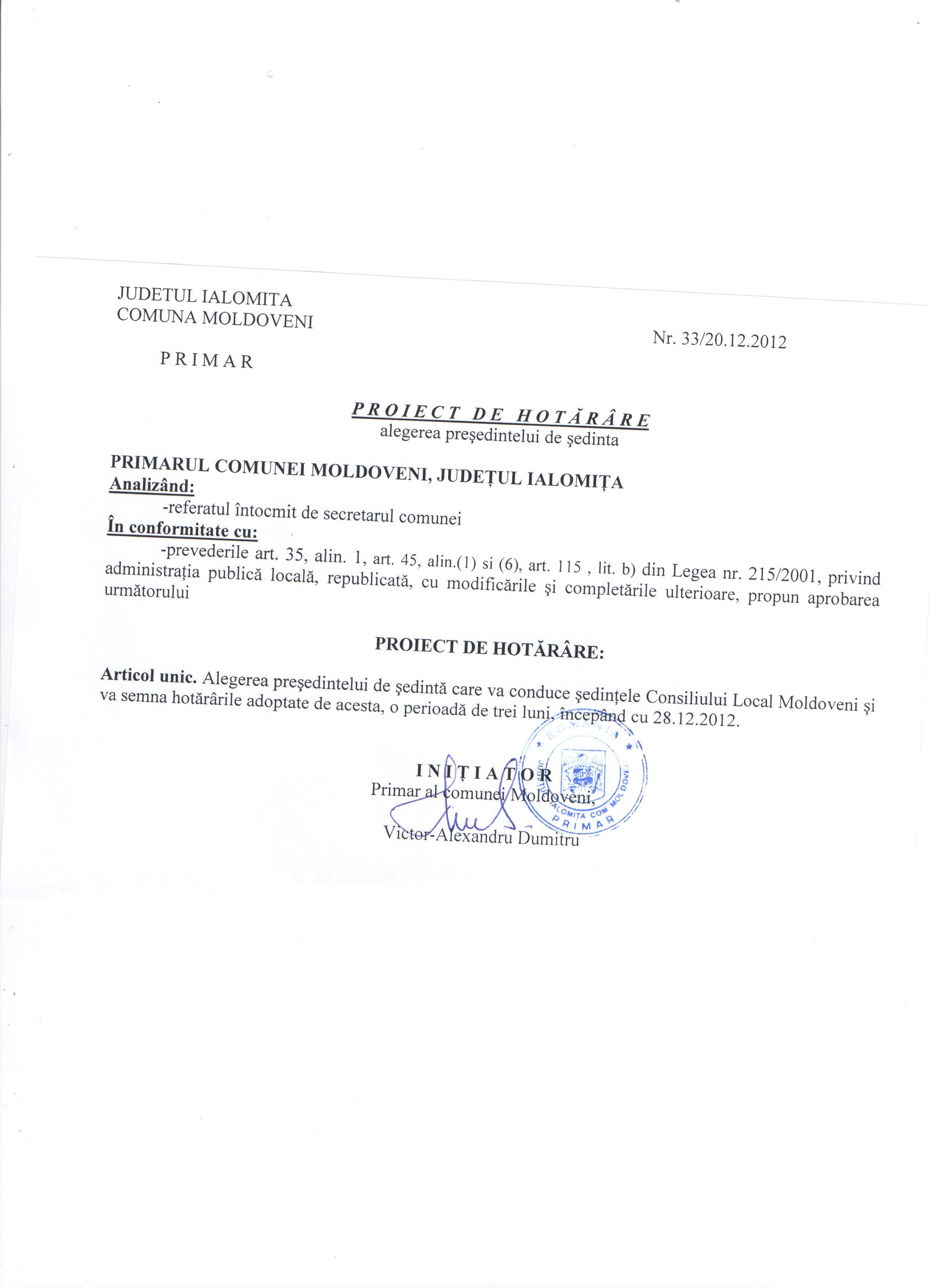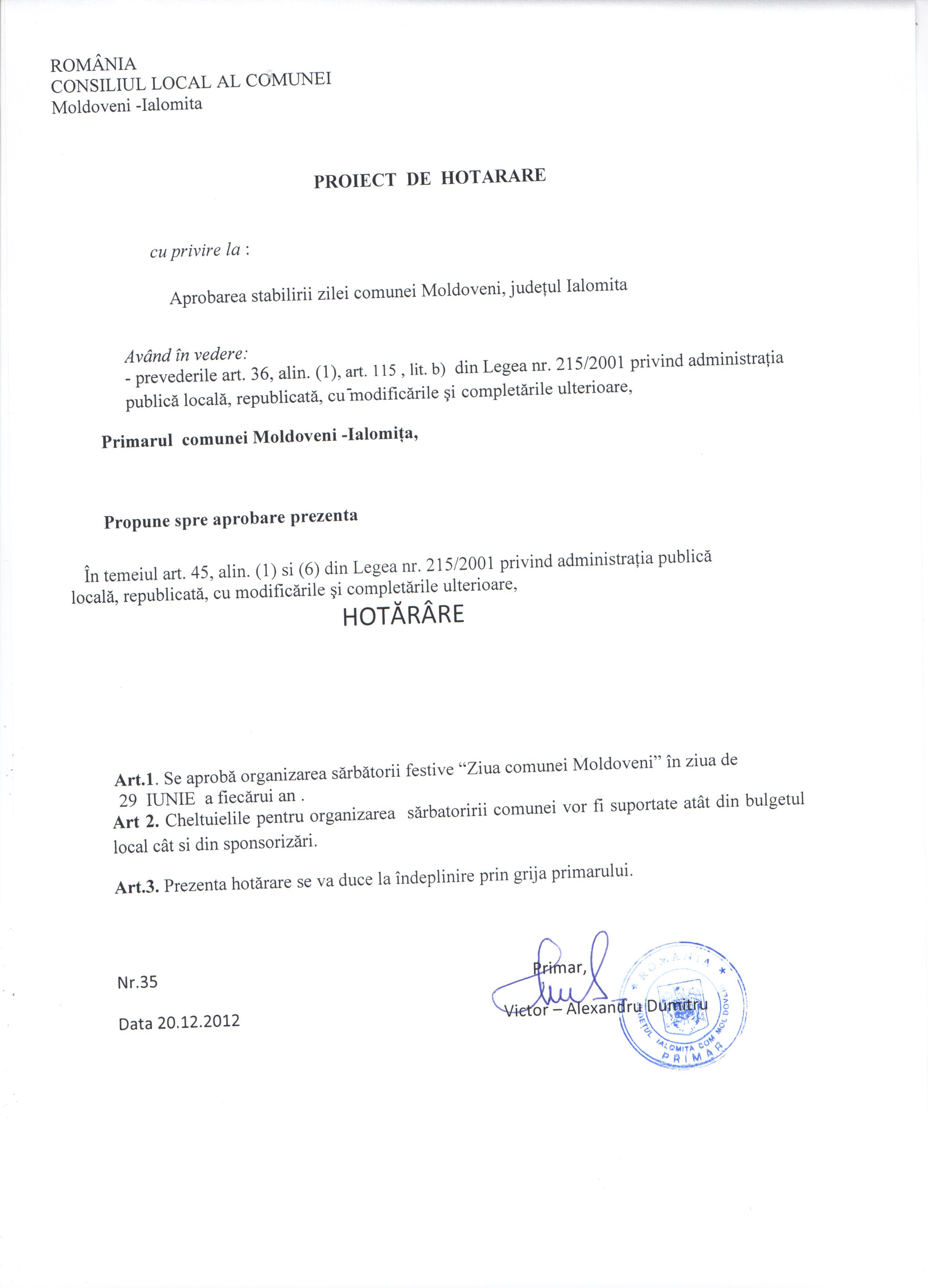 - Hot. nr. 22/17.05.2013 privind modificarea şi completarea Hotărârii Consiliului Local nr. 19/20.09.2010 ,Moldoveni-Ialomiţa.